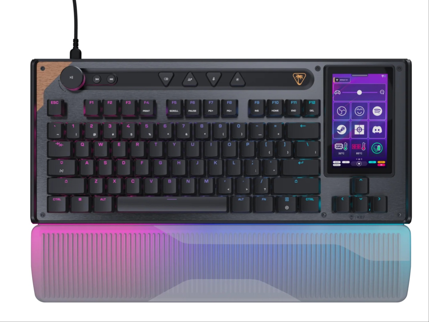 Zaczynając od Command KB7 TKL, jest to przewodowa klawiatura z przełącznikami z efektem Halla z regulacją aktywacji i Rapid Trigger. Bardziej interesującym elementem jest 4,3-calowy ekran dotykowy o nazwie Command Touch Display, który ma wbudowane elementy sterujące OBS i funkcje Streamlabs, dzięki czemu strumieniowanie jest bardziej płynne. Oferuje on jednak znacznie więcej funkcji, więc użytkownicy, którzy nie streamują, również mogą w pełni z niego korzystać. Umożliwia ona uruchamianie makr, przełączanie profili, dostosowywanie dźwięku, uruchamianie aplikacji i monitorowanie statystyk systemowych.