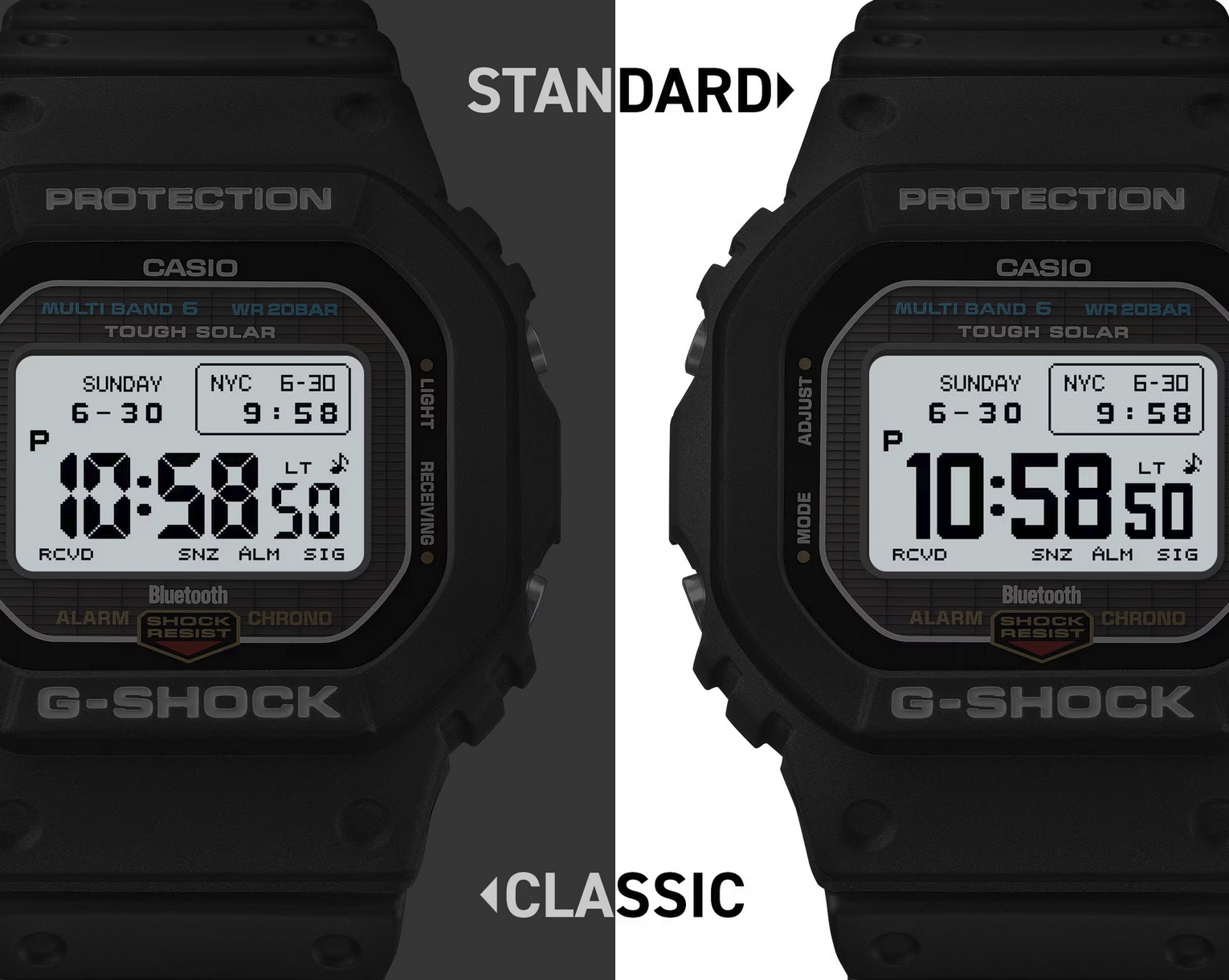 Zdjęcia produktu pokazują dwa tryby wyświetlania - standardowy i klasyczny - przy użyciu nowego panelu LCD MIP. Porównanie to sprawia, że poprawa czytelności jest jeszcze bardziej oczywista, zwłaszcza ze względu na sposób, w jaki cyfry utrzymują kontrast przy różnym oświetleniu. Strony produktowe prezentują również oryginalny footprint serii 5600. Oba zegarki trzymają się blisko klasycznego kształtu DW-5600, ale przesuwają elementy wewnętrzne do kombinacji Tough Solar, synchronizacji smartfona Bluetooth i odbioru radiowego Multiband 6. Wyraźna notatka na stronie stwierdza, że panel słoneczny ma wzór przypominający cegłę, podobny do wczesnych projektów G-Shock.