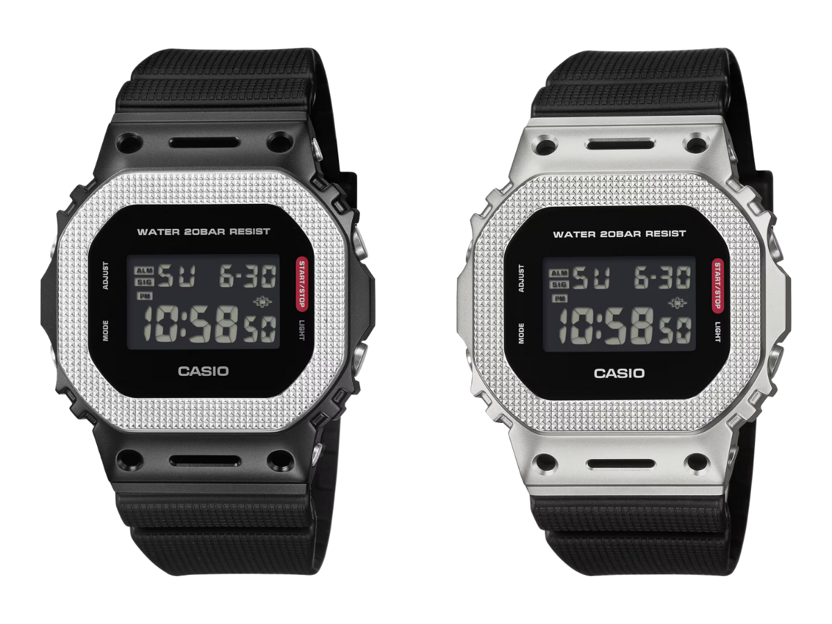 Każdy z tych zegarków Casio G-Steel posiada teksturowany bezel ze stali nierdzewnej z otworami, które odsłaniają jego odporną na wstrząsy strukturę. Kolejną cechą konstrukcyjną jest czerwony akcent na etykiecie funkcyjnej. Cyfrowe zegarki GM5600 mają czarny wyświetlacz z jasnymi cyframi, podczas gdy hybrydowe zegarki GM2100 mają czarną analogową tarczę i te same ciemne wstawki. Każdej wersji towarzyszy teksturowany pasek uretanowy.