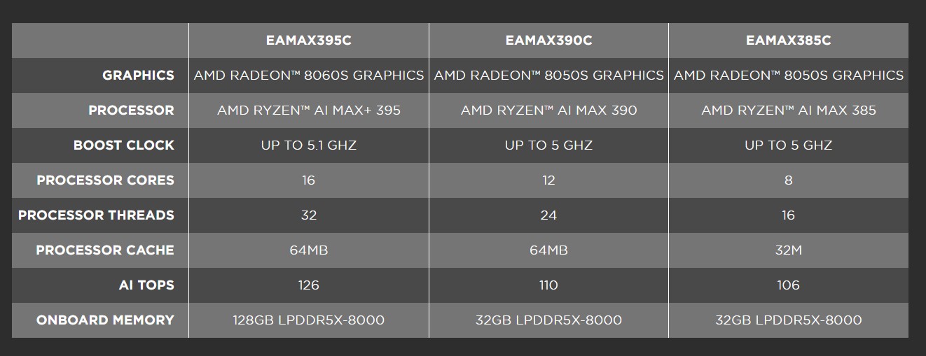Na szczycie oferty znajduje się Magnus EAMAX395C z procesorem Ryzen AI MAX+ 395 i 128 GB wbudowanej pamięci LPDDR5X-8000. Dzięki 16 rdzeniom i 32 wątkom, do 126 TOPS wydajności AI oraz zintegrowanemu układowi GPU Radeon RX 8060S, model ten powinien oferować wystarczającą przestrzeń roboczą do gier 1080p i obciążeń AI. Stwierdziliśmy, że iGPU Radeon RX 8060S zapewnia wydajność podobną do GeForce RTX 4070 Laptop GPU w naszej recenzji Asus ROG Flow Z13więc użytkownicy nie powinni mieć problemów z uruchomieniem większości gier w rozdzielczości 1080p. Inne warianty obejmują model EAMAX390C z procesorem Ryzen AI MAX 390 i EAMAX385C z procesorem Ryzen AI MAX 385.