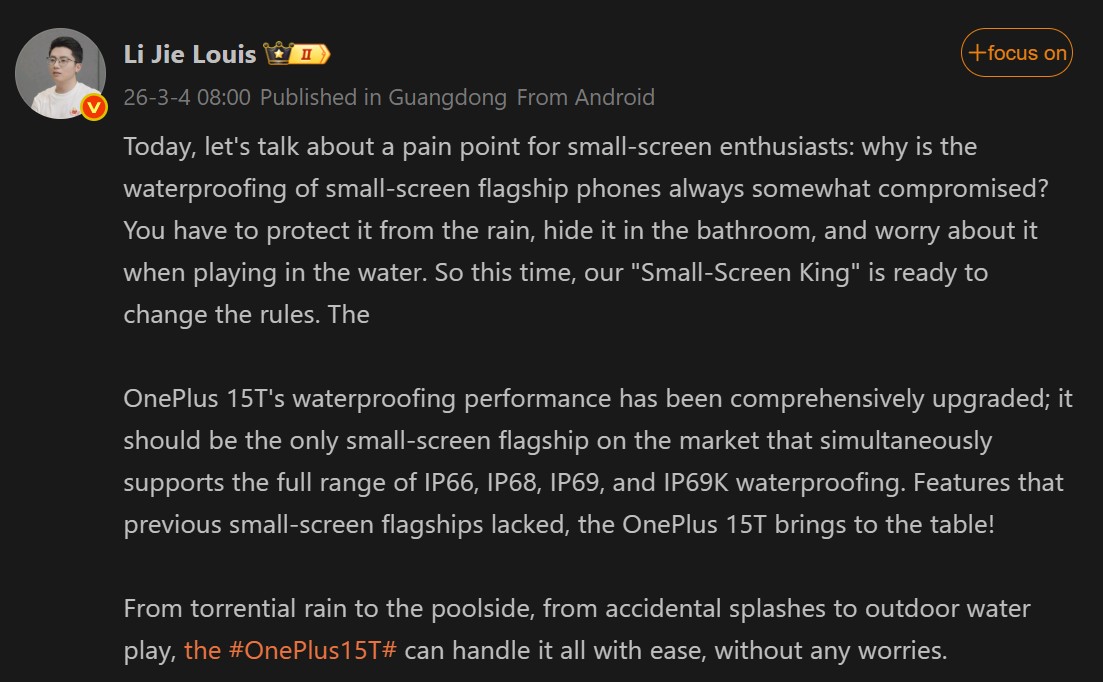 Nadchodzący flagowy telefon Snapdragon 8 Elite Gen 5 ma posiadać "pełen zakres" wodoodporności. W teaserze Louis wspomina o klasach IP69K, IP69, IP68 i IP66. Byłoby to znaczące ulepszenie w stosunku do flagowca ostatniej generacji, który miał tylko stopień ochrony IP65, a te stopnie ochrony przed wnikaniem odpowiadają temu, co OnePlus 15 wnosi do stołu (12/256 GB curr. $768.87 na TradingShenzhen).