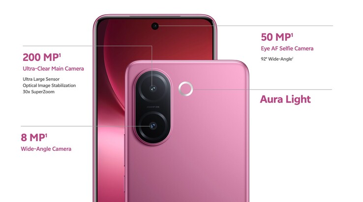 Aparat do selfie 50 MP f/2.0 z autofokusem znajduje się w centralnym otworze. Moduł aparatu w kształcie pigułki z tyłu mieści główny aparat 200 MP f/1.88 i ultraszerokokątny aparat 8 MP f/2.2. Wewnątrz smartfona znajduje się procesor MediaTek Dimensity 7360 Turbo, który ma cztery wydajne rdzenie ARM Cortex-A78 o podwyższonym taktowaniu do 2,5 GHz i cztery wydajne rdzenie Cortex-A55. Smartfon jest dostarczany z Android 15, a Vivo obiecuje trzy główne aktualizacje systemu operacyjnego i pięć lat poprawek bezpieczeństwa.