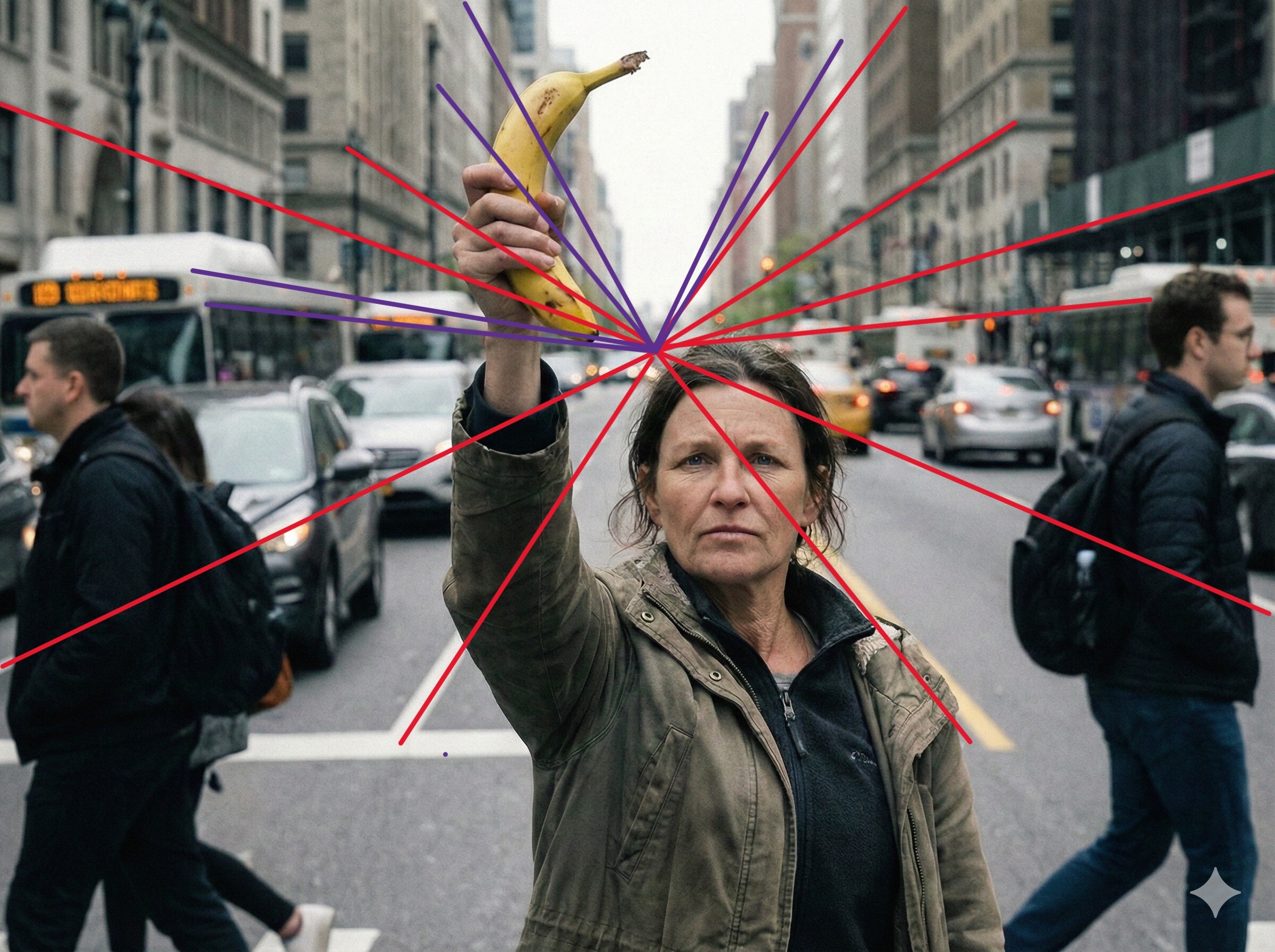 Diabeł tkwi też w szczegółach. Gemini, a raczej Nano Banana Pro, dobrze radzi sobie z renderowaniem perspektywy. Na pierwszy rzut oka widoczny jest tylko jeden znikający punkt. Jednak bliższe spojrzenie ujawnia, że pomimo rozmycia, niektóre linie znikających punktów przecinają kondygnacje lub, w przypadku dwóch autobusów po lewej stronie, po prostu znikają w powietrzu. Linie, które uznaliśmy za niespójne, pokolorowaliśmy na fioletowo po określeniu znikającego punktu perspektywy