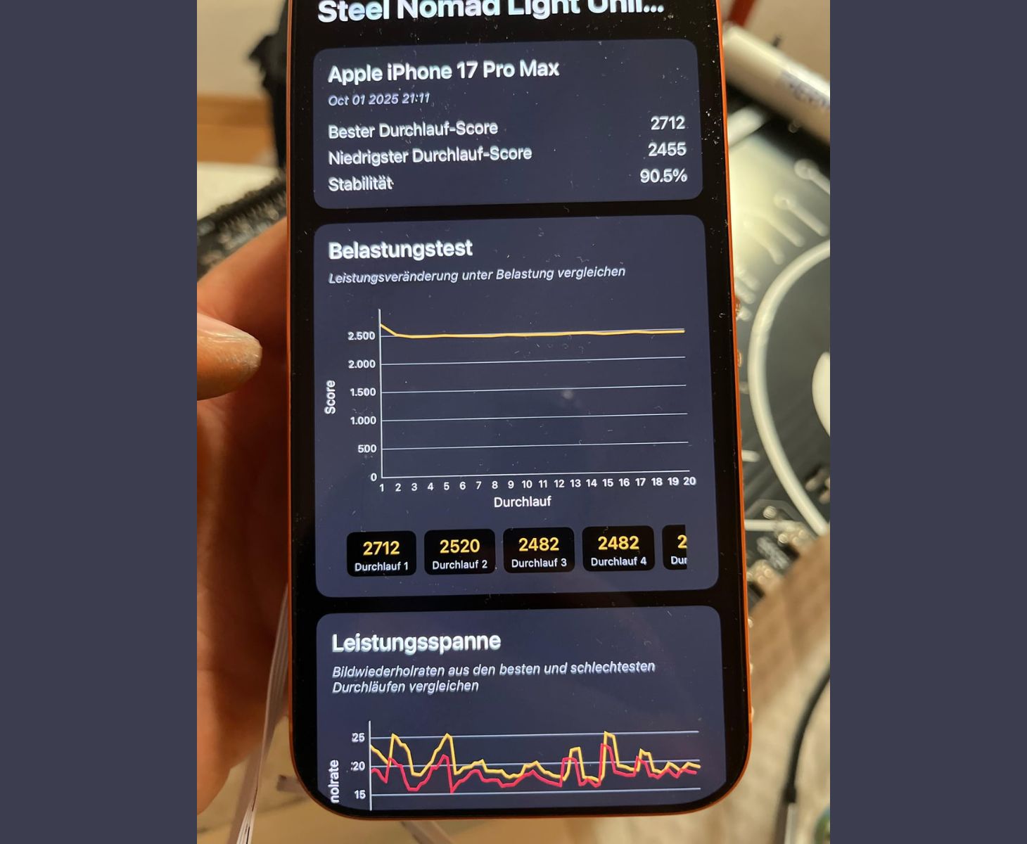 O ile dobrze zrozumieliśmy, metalowa ramka telefonu działa jak rozpraszacz ciepła, a dzięki paście termicznej oraz dużym miedzianym ciepłowodom i aluminiowym żeberkom (niektóre wyposażone w małe wentylatory), ciepło jest wyciągane i rozpraszane znacznie wydajniej niż pozwala na to wbudowany system pasywny. Dzięki temu chip A19 pozostaje chłodniejszy przez dłuższy czas, co przekłada się na wyższą stałą wydajność i stabilność w testach porównawczych, utrzymując około 90% w teście 3DMark Stress Test, jak pokazano na zdjęciu.