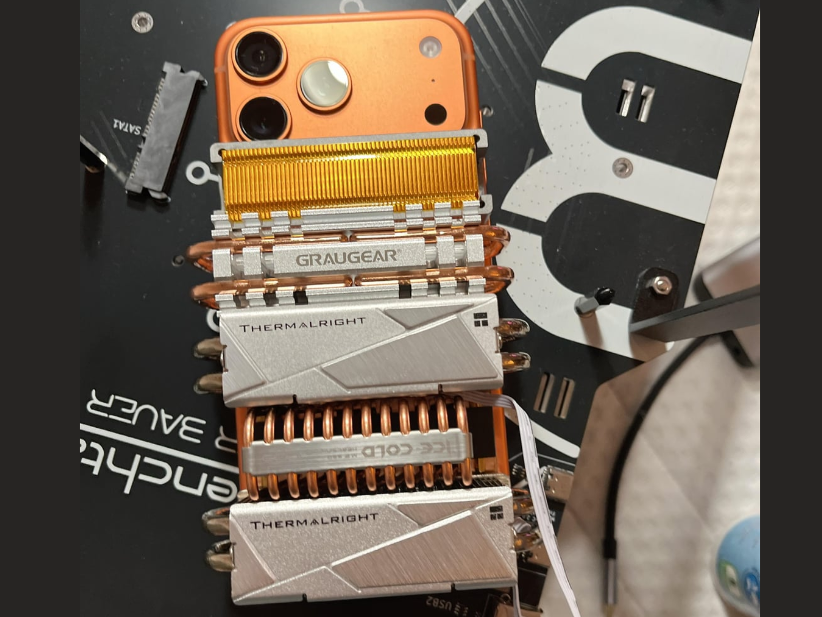 Zdjęcia w poście na Reddicie zatytułowanym "17 Pro Max Cooling with M2 SSD Cooler 90% Stability in 3D Mark Stress Test" pokazują konfigurację chłodzenia DIY, w której radiatory i rurki cieplne klasy desktop, zwykle używane do dysków SSD, są zamontowane na iPhonie 17 Pro Max w celu zmniejszenia dławienia termicznego podczas intensywnego grania lub testów porównawczych.