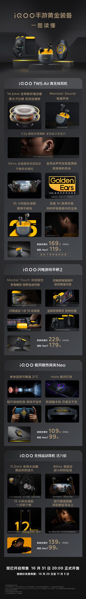 Obejmują one również znajdujący się w pobliżu telefonu Lightning Gamepad 2 oraz iQOO TWS Air, z których ten ostatni pakuje imponująco duże ~14mm przetworniki dla"Monster Sound" do niepozornie generic form-factor. Nowe dodatki kosztują 109 (~US$15), 229 (~US$32) i 169 (~US$23) juanów samodzielnie, chociaż odwiedzający sklep internetowy Vivo mogą je dostać za jeszcze mniej, gdy zostaną dodane do zamówienia na Neo7