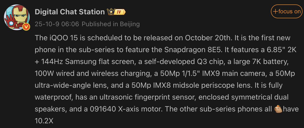 Na swoim oficjalnym koncie Weibo firma oświadczyła, że iQoo 15 zostanie zaprezentowany 20 października o godzinie 19:00 czasu lokalnego w Shenzhen. Ponadto firma ujawniła, że urządzenie trafi do sprzedaży natychmiast po tym wydarzeniu. Proszę zauważyć, że ta premiera jest specyficzna dla rynku chińskiego globalna data premiery nie została ujawniona w momencie pisania tego tekstu.